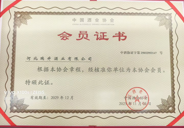 “加入中国酒业协会是瑞升酒业发展史上的重要里程碑。”河北瑞升酒业法定代表人冯瑞生表示,未来企业将充分享有协会会员优先权,积极参与行业标准研讨、技术培训、国际交流等活动,第一时间获取行业前沿动态与政策资讯,借助协会平台提升品质管控与人才培养水平,持续优化产品结构。同时,企业也将严格履行会员义务,遵守行业自律规范,主动参与“全国理性饮酒宣传周”等公益活动,为行业高质量发展贡献力量。